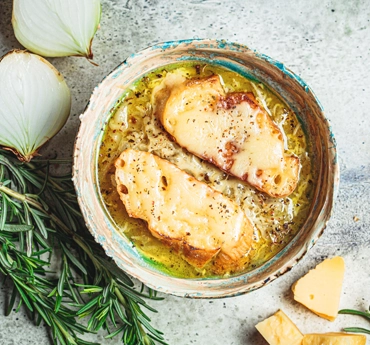 Une soupe réconfortante à base d’oignons caramélisés et de bouillon, garnie de pain grillé et de fromage fondu, puis gratinée au four.